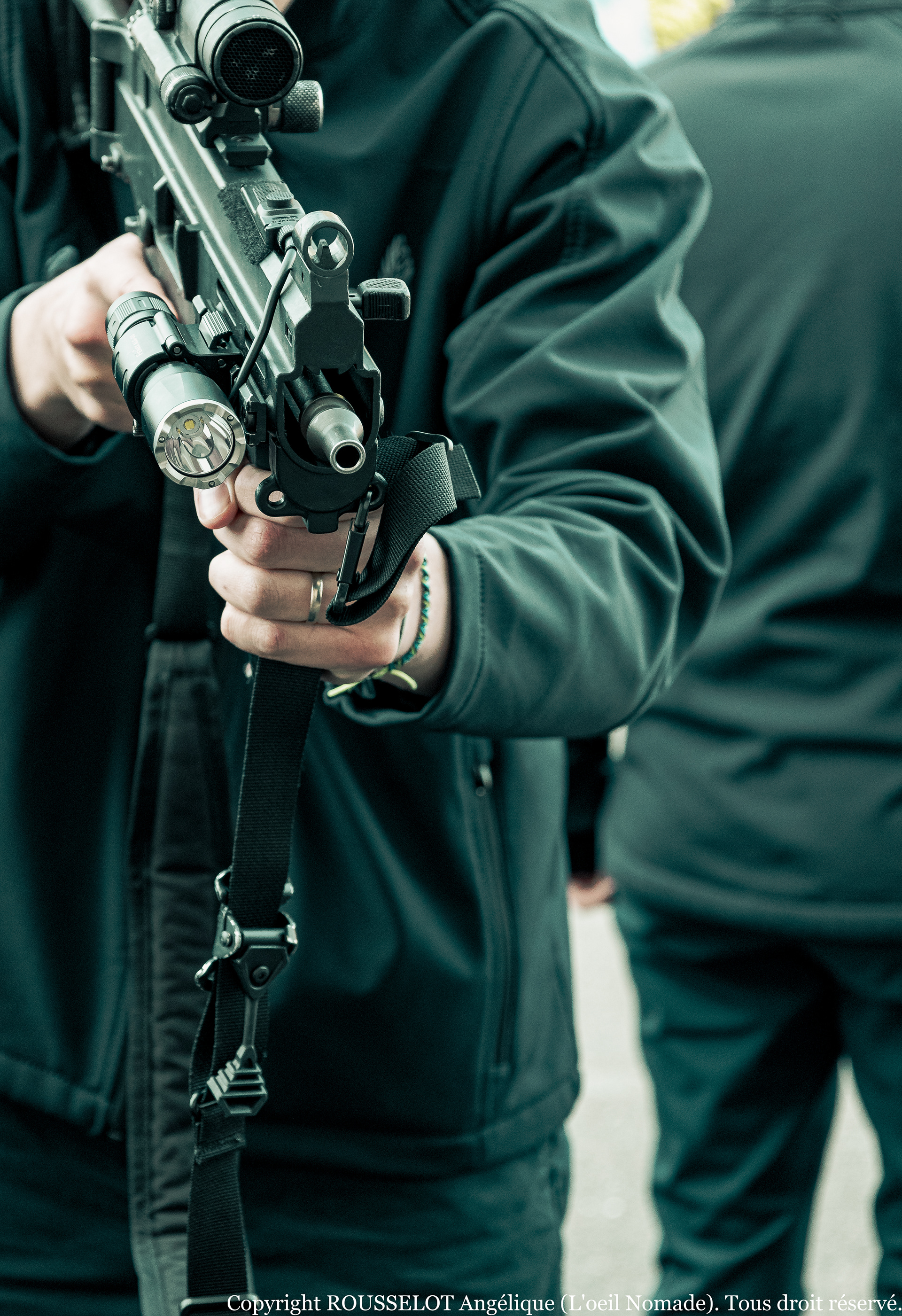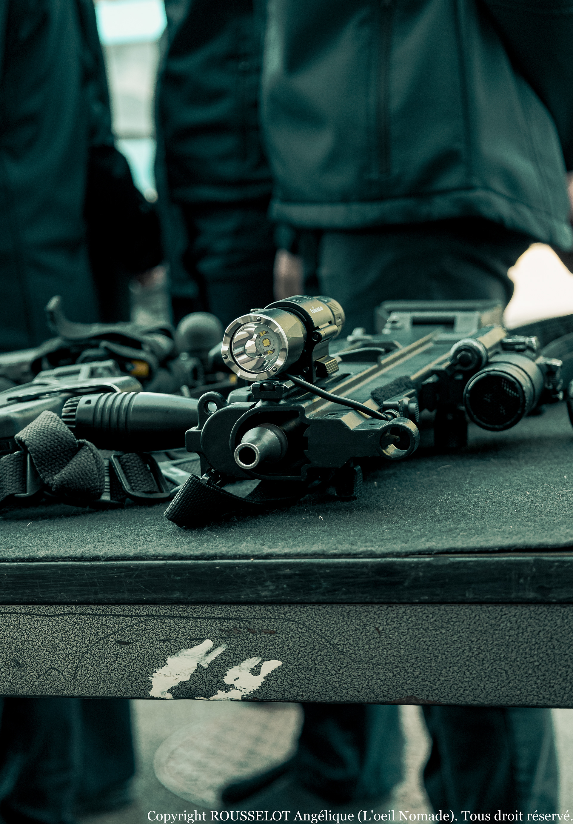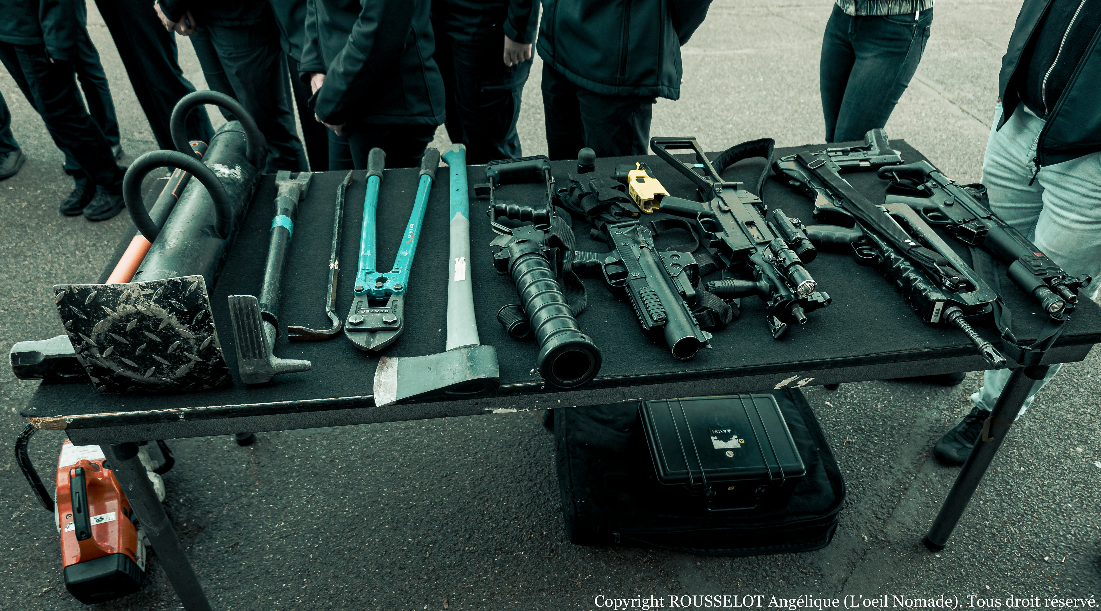 L’amphithéâtre a d’abord posé les bases : l’histoire du GBGM, ses missions, ses valeurs. Puis le concret est venu au contact des mains : casques, gilets, protections lourdes, armes d'intervention. Le matériel, lourd de sens autant que de poids.