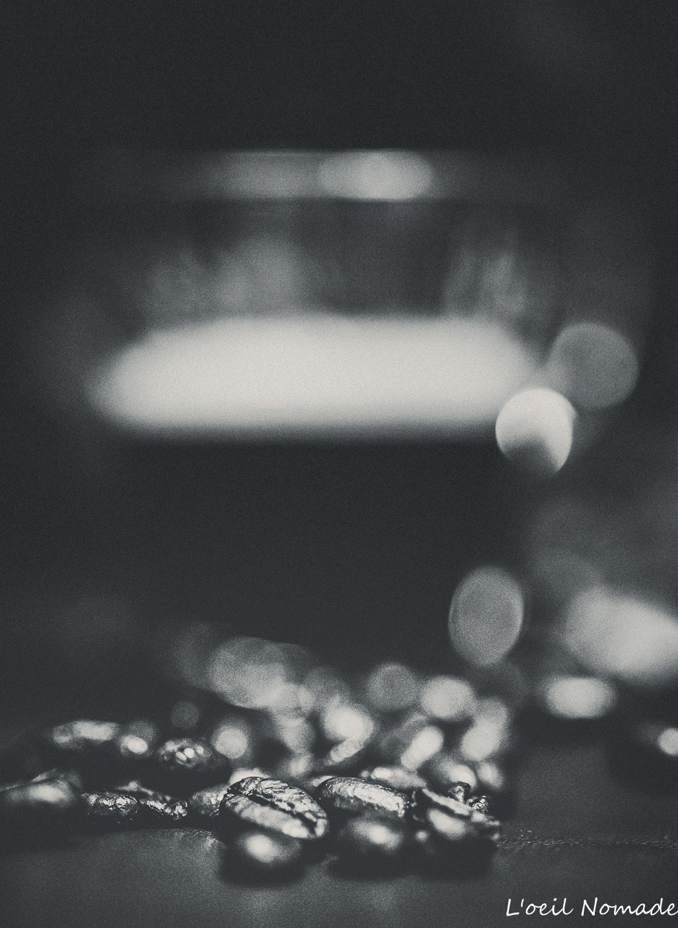 Photographie de packshot culinaire au Havre : café noir et grains de café sur fond texturé, jeu de contrastes et mise en lumière des arômes.