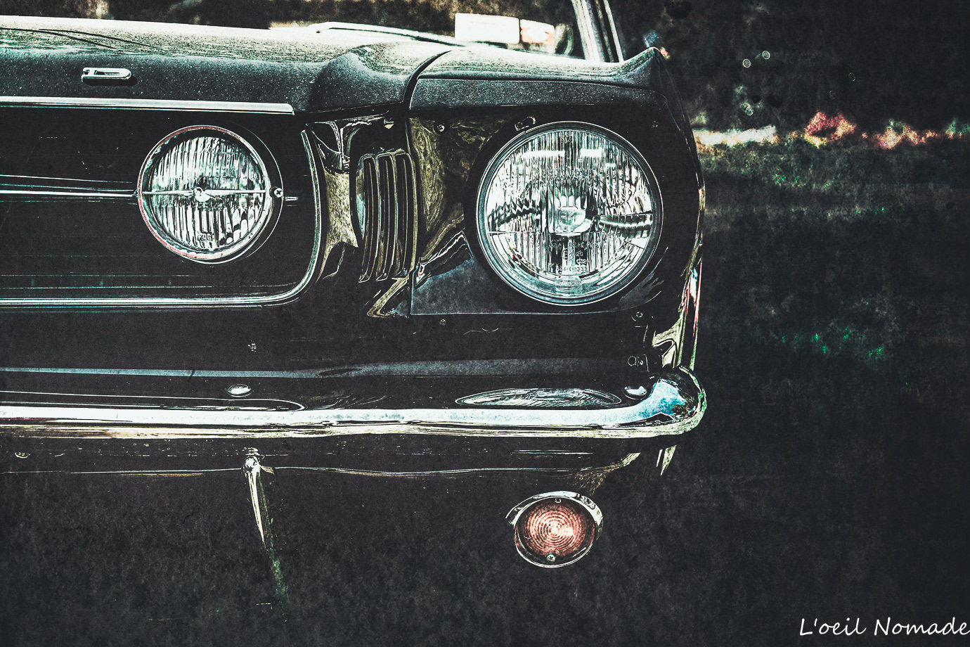 Photographie artistique Ford Mustang jaune dans hangar industriel, style urbain et contrasté L'œil Nomade.