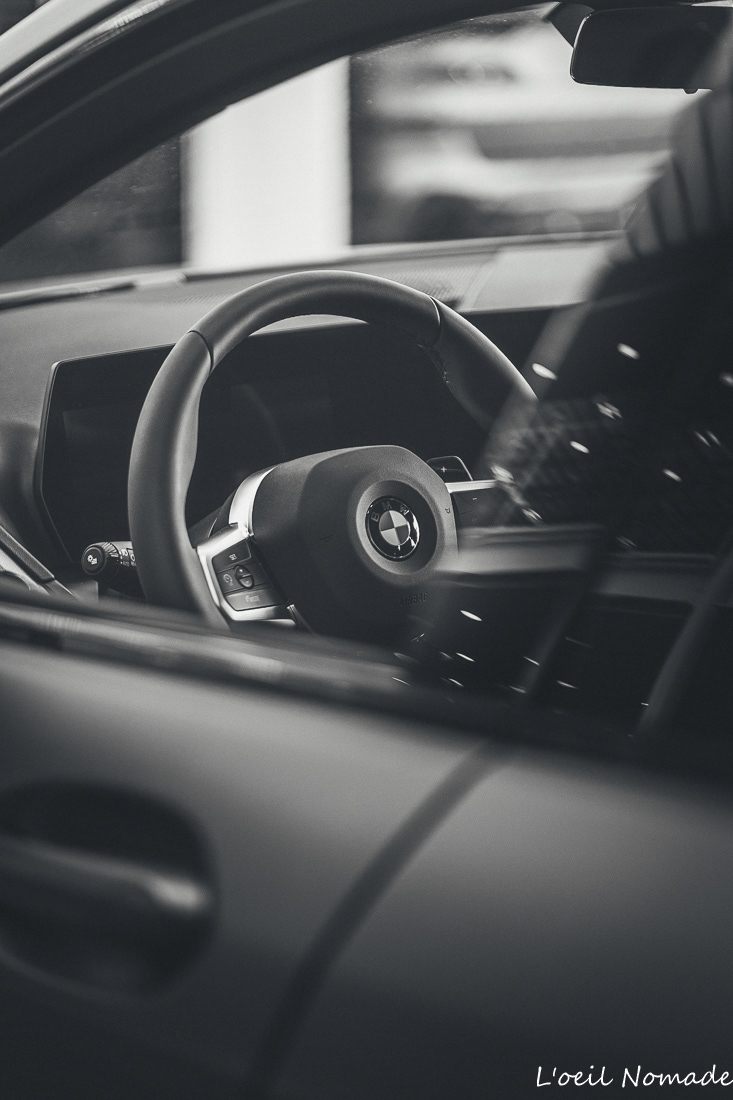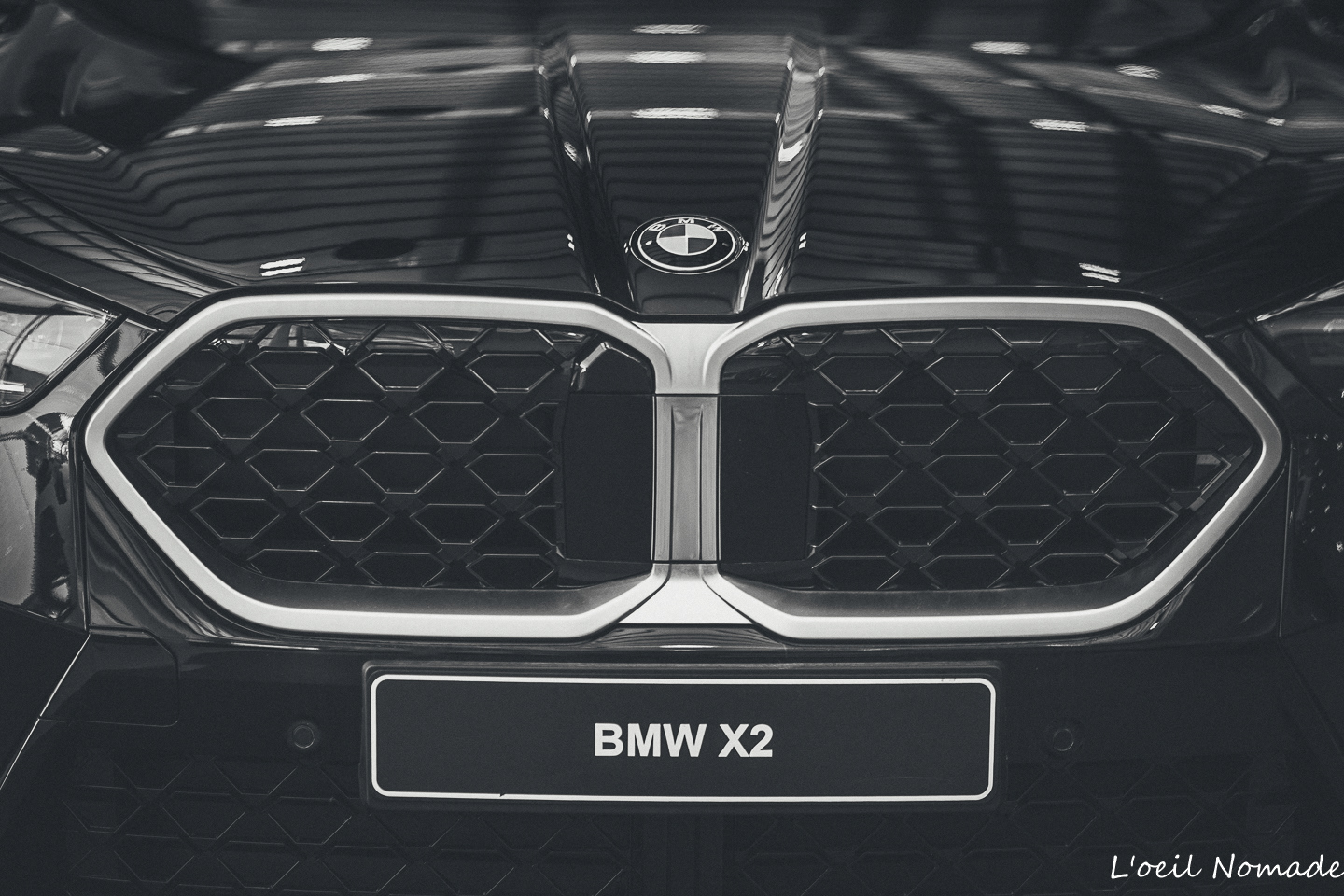 Gros plan sur la calandre iconique BMW, performance automobile, photographie d'autorité B2B par L’œil Nomade.