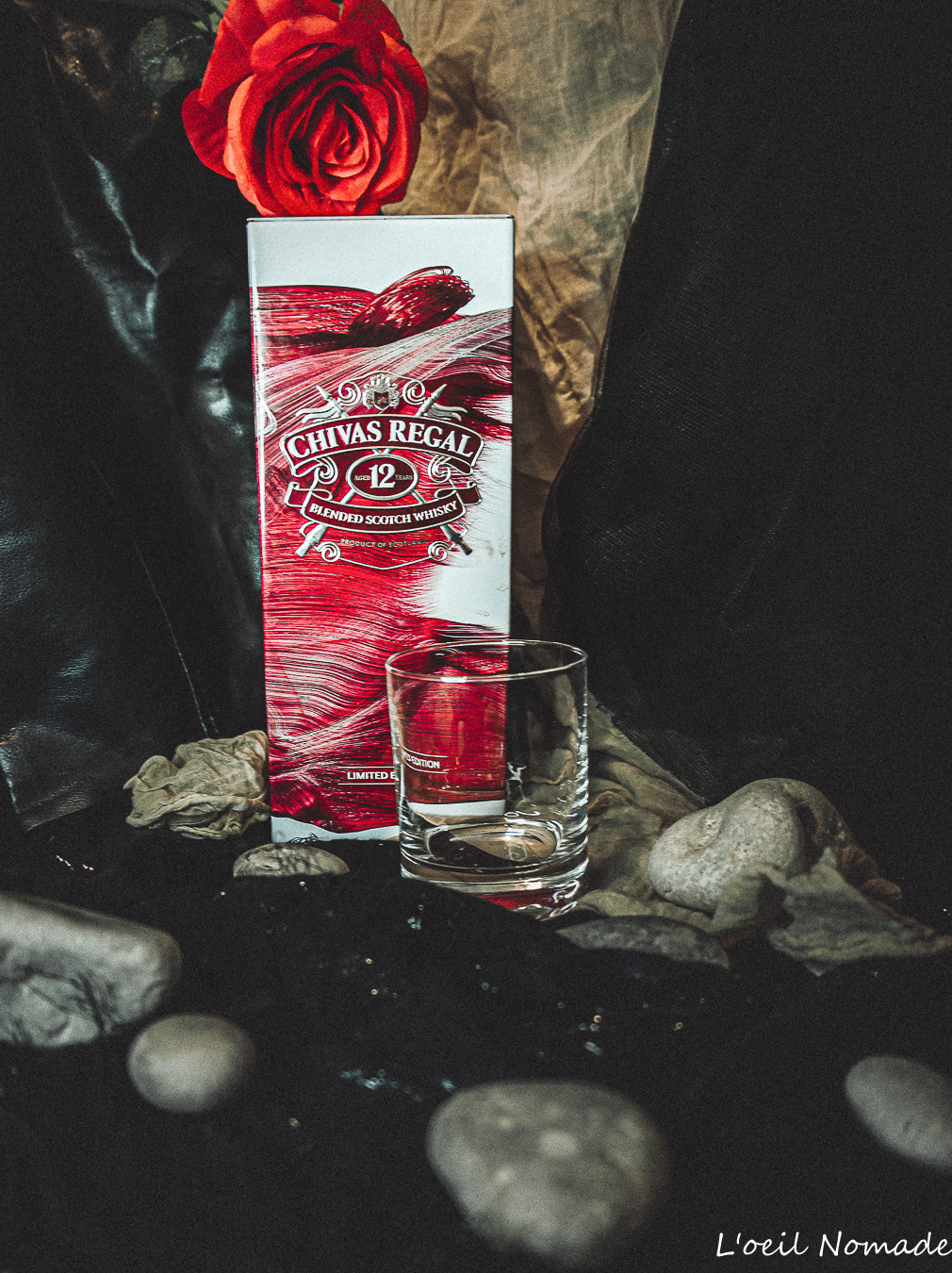 Packshot de luxe : détail de l'étiquette d'une bouteille de whisky Chivas Regal, jouant sur les reflets du verre et la profondeur de champ.