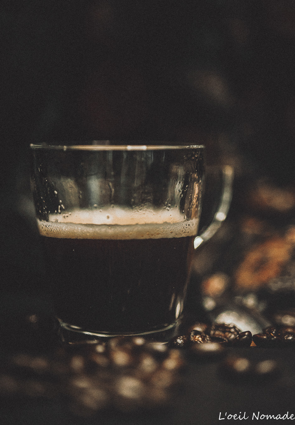Nature morte : gros plan sur des grains de café torréfiés et des oranges, travaillant la complémentarité des couleurs et des textures.