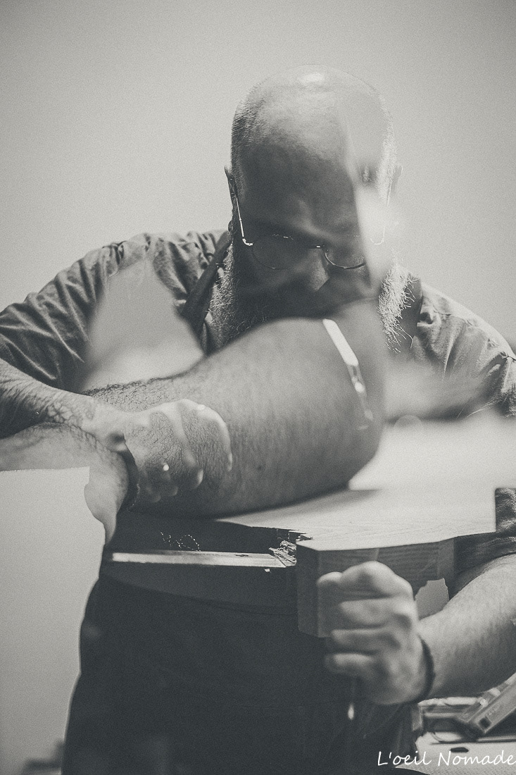 Luthier Wooden Owl utilisant un rabot à main, reportage artisanat Le Havre, focus sur le travail du bois.