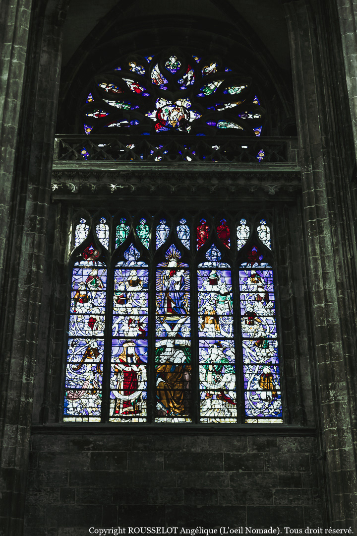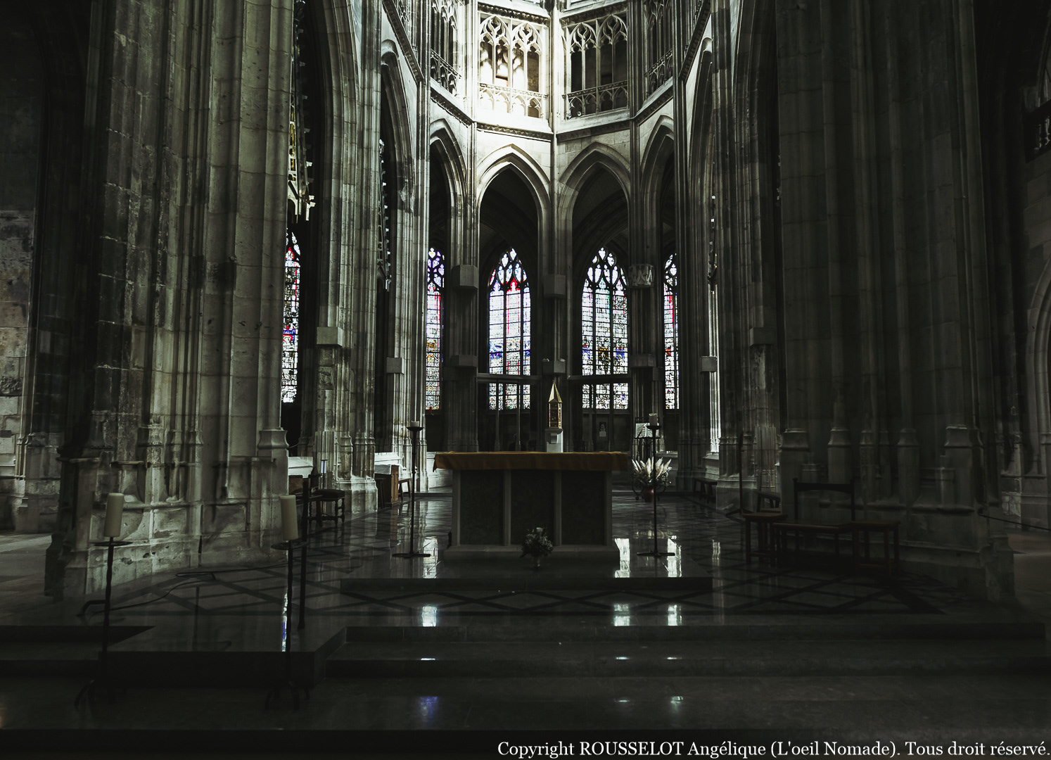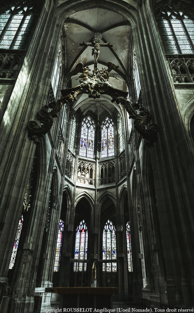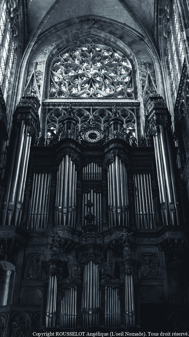 À l’intérieur, c’est autre chose. L’ombre et la lumière se répondent, les vitraux balancent des couleurs qui s’écrasent au sol comme un vitrail explosé. Les voûtes montent haut, très haut. Et puis il y a l’orgue, immense, comme un poumon figé.