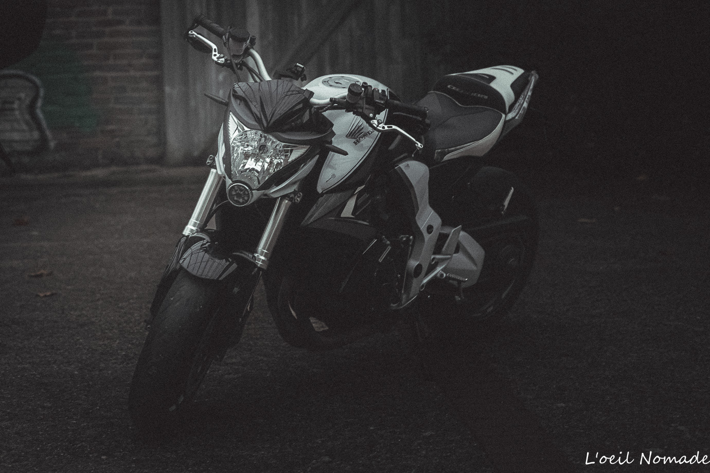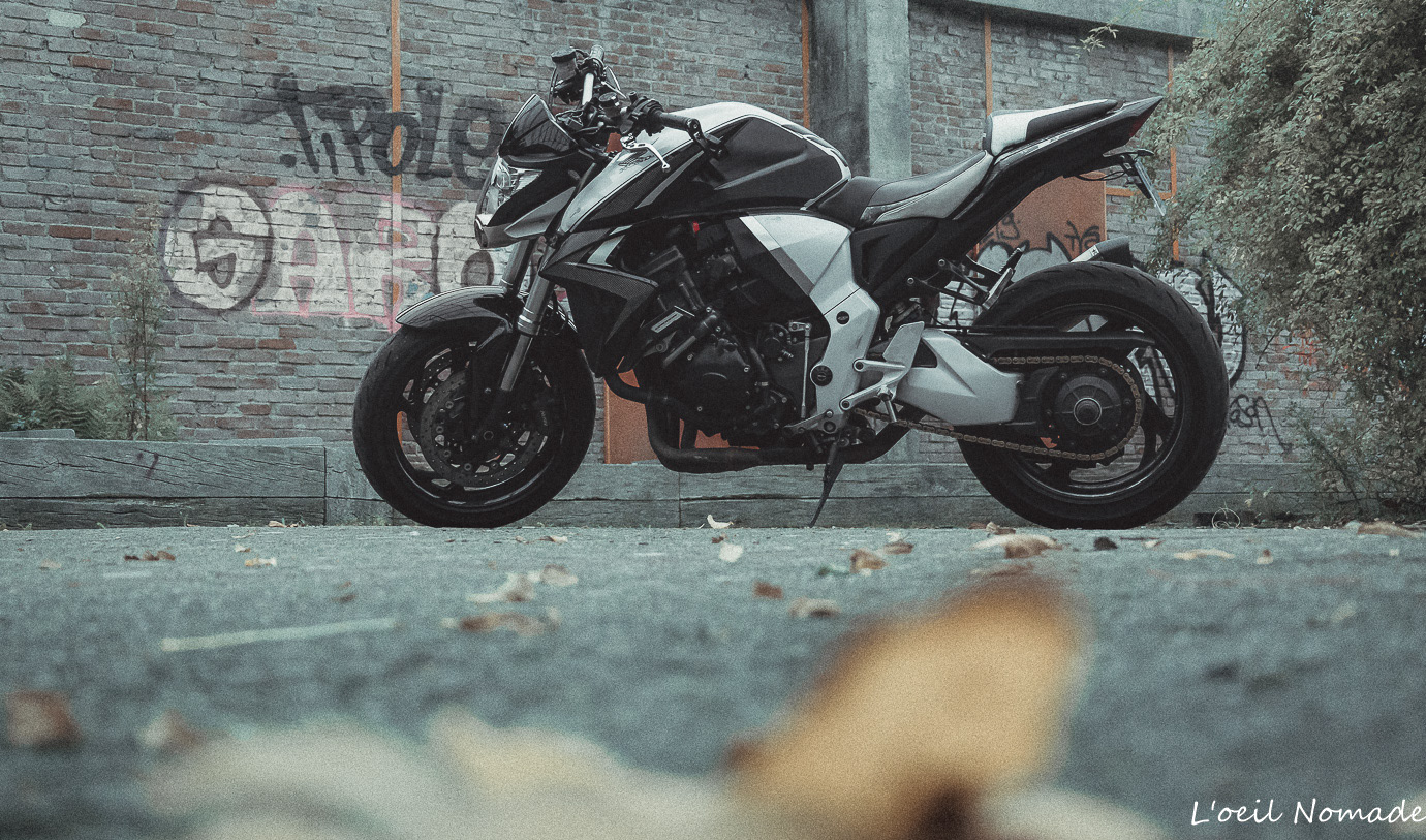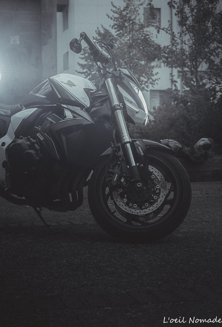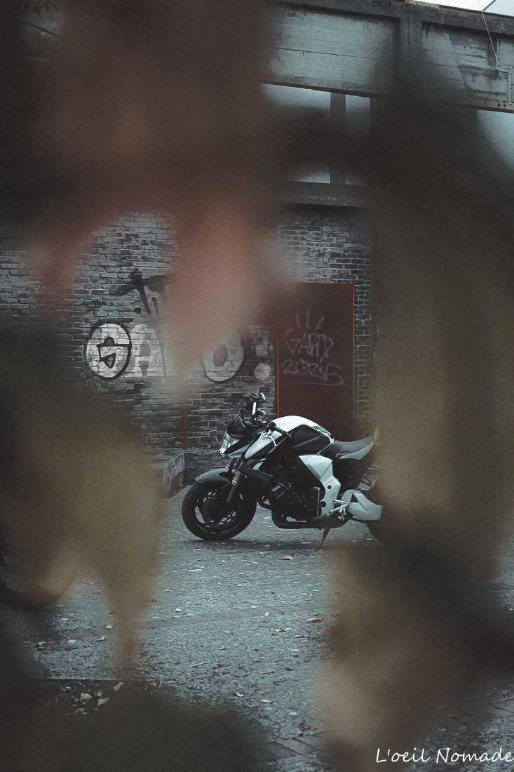 Reportage photo moto ambiance urbaine et industrielle, mise en valeur artistique du design sans détails mécaniques.