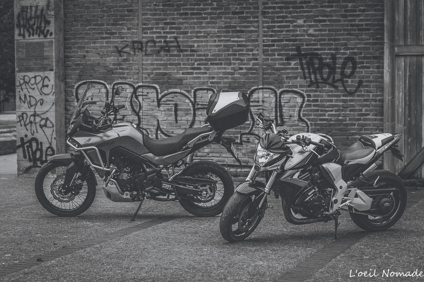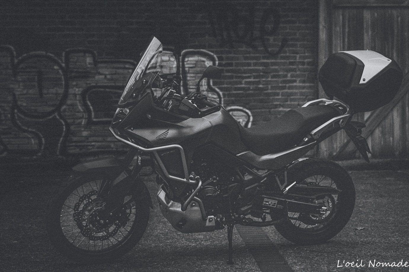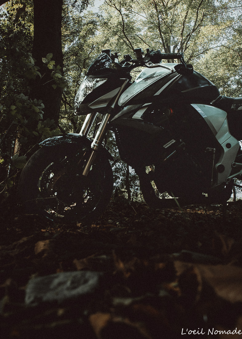 Reportage photo moto ambiance urbaine et industrielle, mise en valeur artistique du design sans détails mécaniques.