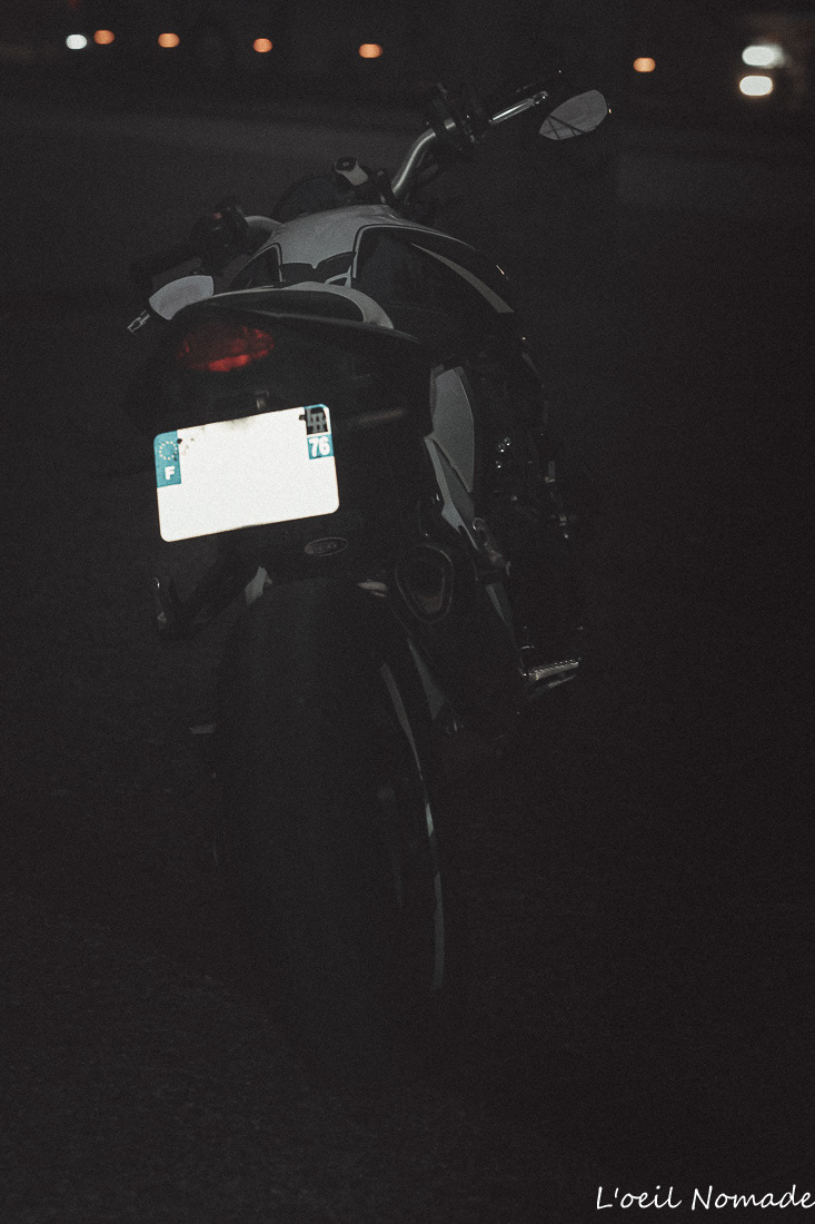 Photographie artistique moto de nuit Le Havre, jeux d'ombres et lumières "Dark Muted", portrait de véhicule de caractère.